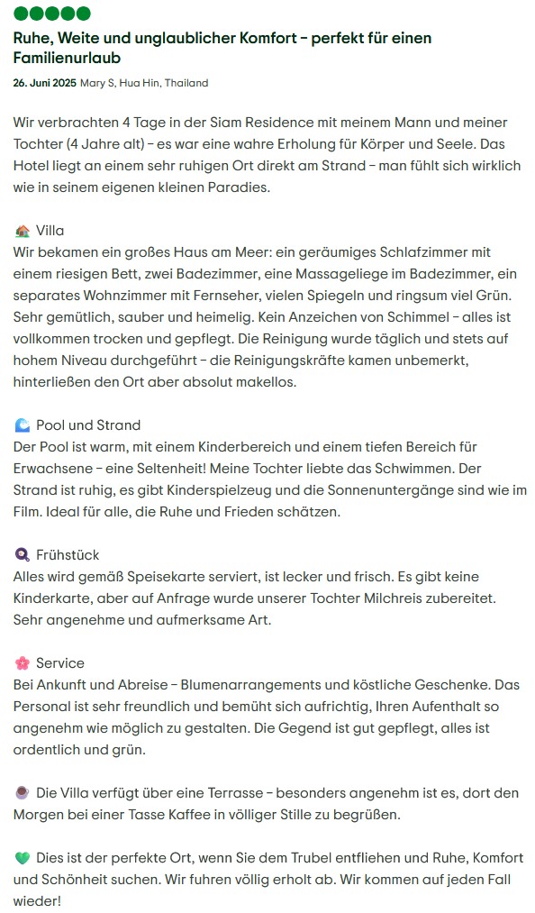“We love so much your: flowers, birds, silence, big bungalow, fine breakfast, clean pool, fantastic massages, horse ranch in 5 minutes, very friendly and beautiful dressed staff! We will tell our friends and family how fine it is in Siam Resort!”